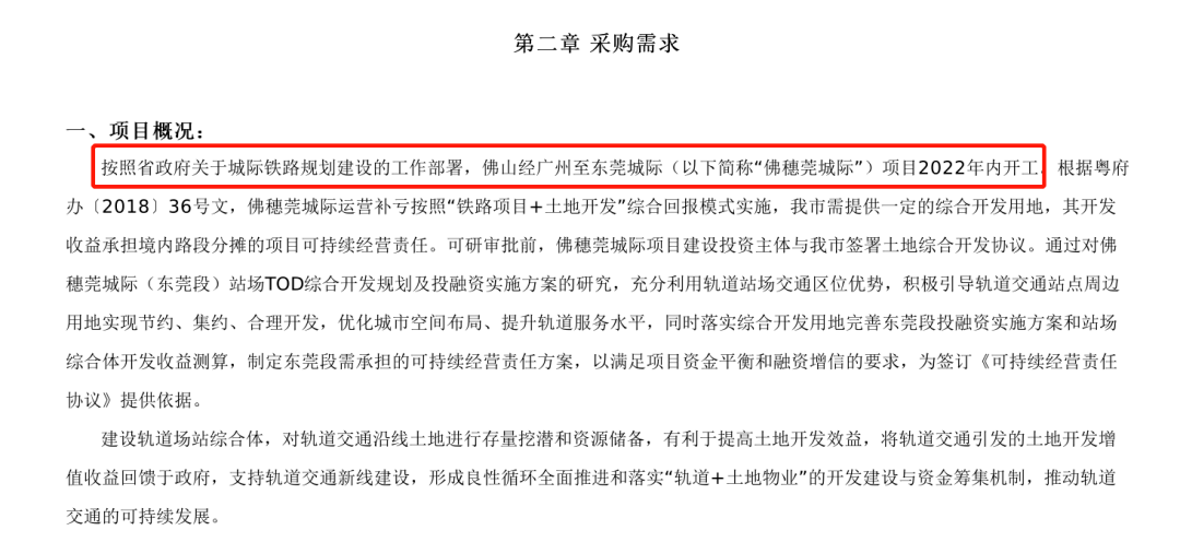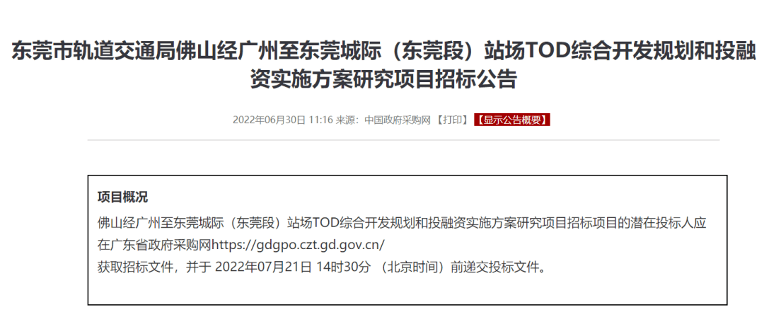 6月30日,广东省政府采购网发布了《佛山经广州至东莞城际东莞段站场TOD综合开发规划和投融资实施方案研究项目的招标公告》。