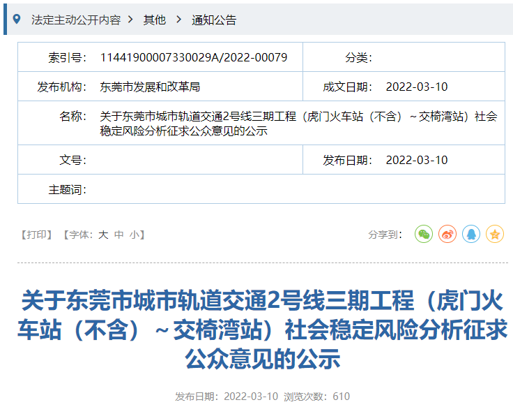 近日,东莞市发展和改革局官网发布《关于东莞市城市轨道交通2号线三期工程(虎门火车站(不含)~交椅湾站)社会稳定风险分析征求公众意见的公示》。