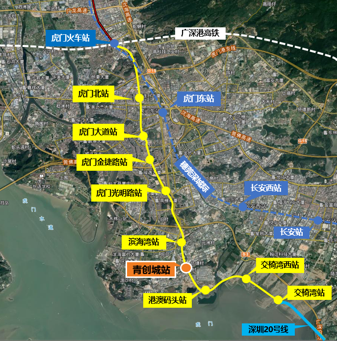 其中,虎门大道站与规划地铁10号线换乘,滨海湾站与广州地铁22号线、东莞地铁9号线、深茂高铁及中南虎城际换乘,港澳码头站与地铁14号线换乘,交椅湾站与地铁3号线换乘。