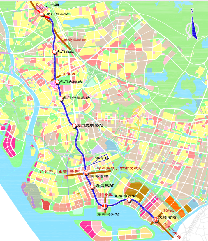 ● 在中海路路口,设终点站交椅湾站,与东莞3号线一期、规划深圳20号线换乘。